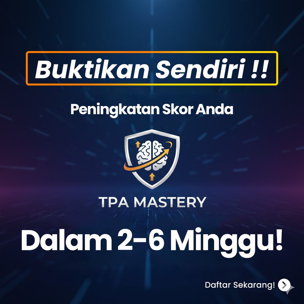 Program persiapan TPA terbaik untuk mahasiswa, profesional, dan karyawan perusahaan, paling sistematis yang dirancang untuk membantu Anda memahami pola soal, menguasai strategi pengerjaan cepat, dan teknik pengerjaan efektif yang membuat skor meningkat drastis.
