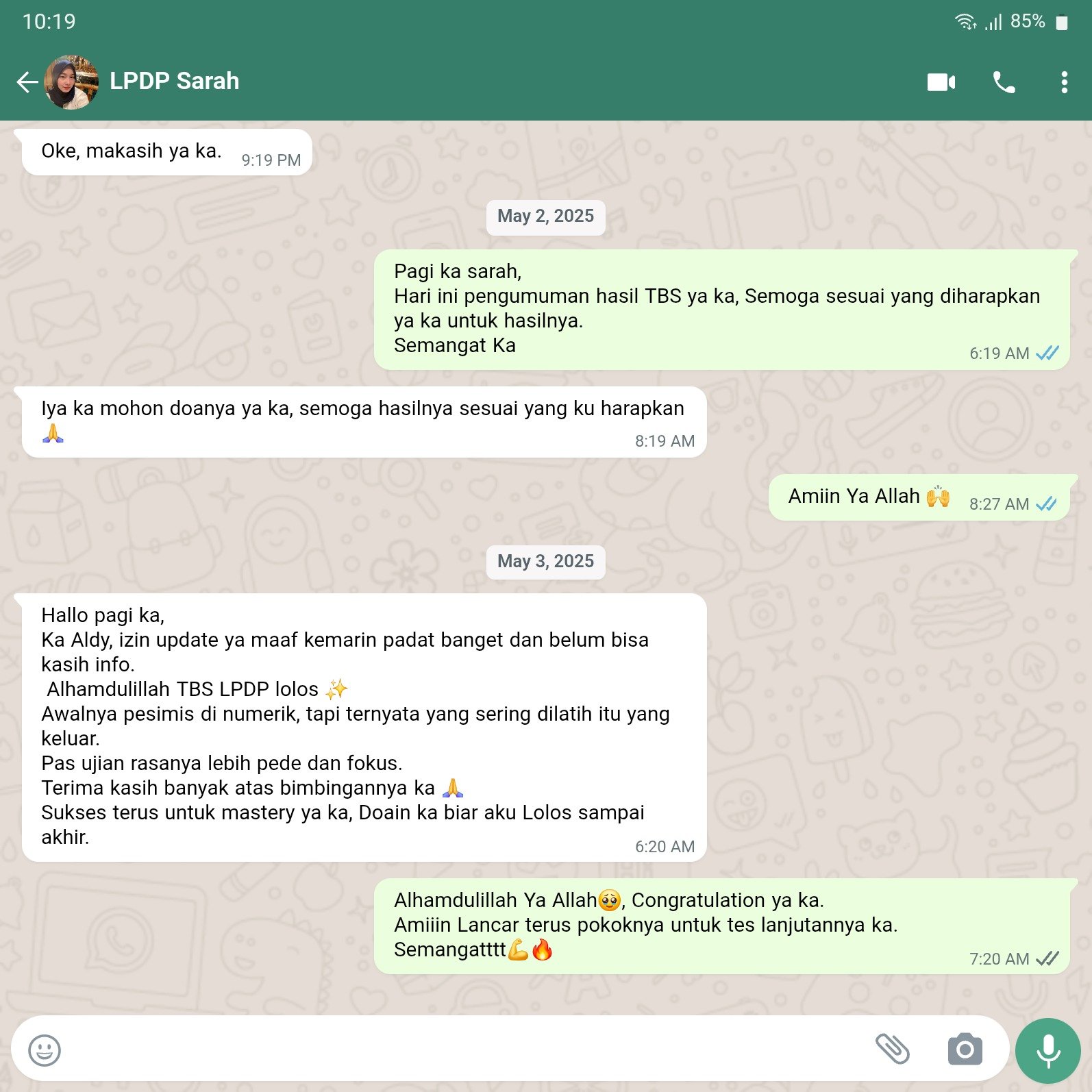 Mentoring intensif menghadapi interview LPDP: menggali cerita personal, leadership, problem-solving, behavioral mock interview.